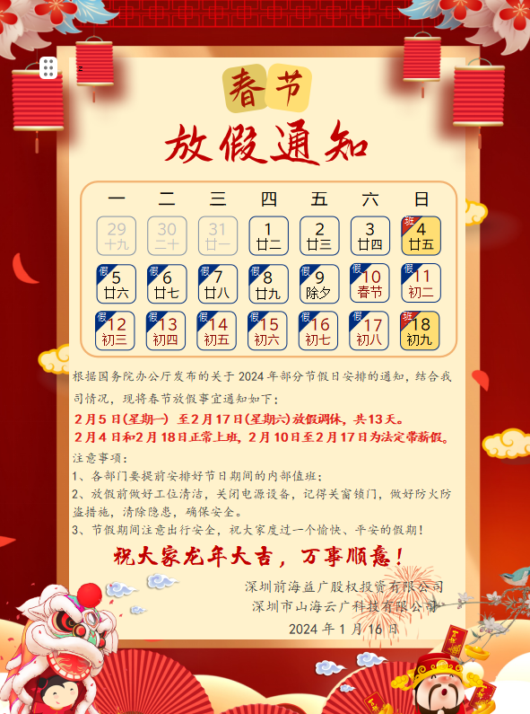 根據(jù)國(guó)務(wù)院辦公廳發(fā)布的關(guān)于2024年部分節(jié)假日安排的通知,結(jié)合我司情況,現(xiàn)將春節(jié)放假事宜通知如下: